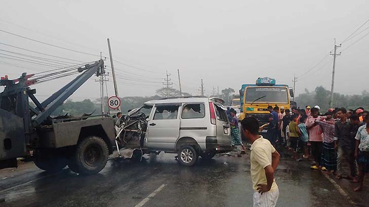 পুলিশ ও নিহতের স্বজনরা জানান, মায়ের মৃত্যুর খবর পেয়ে দীর্ঘদিন পর ব্রাহ্মণবাড়িয়া এলাকার ইতালি প্রবাসী ছেলে শাহ আলম (৬২) বৃহস্পতিবার সকালে বাংলাদেশে আসেন। ঢাকার শাহজালাল ইন্টারন্যাশনাল বিমানবন্দর থেকে তাকে আনতে ছোট বোনের স্বামী সেলিম ও ভাগ্নে সাব্বির সকালে একটি নোয়া মাইক্রোবাস নিয়ে এয়ারপোর্টে যান। সেখান থেকে শাহ আলমকে নিয়ে বাড়িতে ফিরছিলেন।