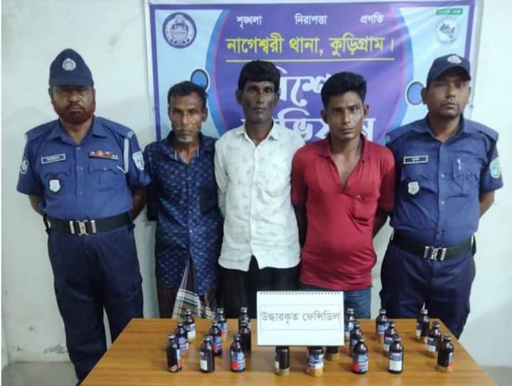কুড়িগ্রাম জেলার ভূরুঙ্গামারী থানা পুলিশের একটি চৌকস টিম অদ্য ১৯ আগস্ট রাত আনুমানিক ০২:৩০ ঘটিকায় ভূরুঙ্গামারী থানাধীন বৈষম্য বিরোধী ছাত্র আন্দোলনের ছাত্রদের সহযোগিতায় ভূরুঙ্গামারী থানাধীন পূর্ব ভোট হাট ১ নং ওয়ার্ড এর খোনাপাড়া সীমান্ত এলাকা থেকে একই এলাকার মাদক কারবারি মো: আশরাফুল আলম (২০) কে ৭৫ বোতল ফেন্সিডিল উদ্ধার সহ হাতেনাতে গ্রেফতার করে। এছাড়াও কুড়িগ্রামের নাগেশ্বরী থানা পুলিশের একটি চৌকস টিম গত ১৮ আগস্ট ২০২৪ রাতে নাগেশ্বরী পৌরসভাধীন বালাসিপাড়া মৌজাসথ ৭ নম্বর ওয়ার্ড বিদ্যুৎ অফিসের দক্ষিণ পাশে পাকা রাস্তার উপর থেকে ফুলবাড়ী কুটি চন্দ্রখানা এলাকার মাদক কারবারি মো: সাইফুল ইসলাম (৫২), আজওয়াটারি এলকাার শ্রী সত্য চন্দ্র সেন (৩৪) ও ললালমনিরহাট সদরের কালোমাটি হরিনচরা এলাকার মো: আব্দুর রশিদ (৪০) দেরকে ২৫ বোতল ফেন্সিডিল সহ হাতেনাতে গ্রেফতার করে।কুড়িগ্রাম জেলা পুলিশের মিডিয়া মুখপাত্র অতিরিক্ত পুলিশ সুপার (পুলিশ সুপার পদে পদোন্নতিপ্রাপ্ত) জনাব মোঃ রুহুল আমীন বলেন, গ্রেফতারকৃত মাদক কারবারিদের বিরুদ্ধে ভূরুঙ্গামারী ও নাগেশ্বরী থানায় মাদকদ্রব্য নিয়ন্ত্রণ আইনে পৃথক দুইটি মামলা রুজু করা হয়েছে। কুড়িগ্রাম জেলায় মাদক নির্মূলে আমাদের এই অভিযান নিয়মিতভাবে অব্যাহত থাকবে, আমরা সকলের সম্মিলিত সহযোগিতা প্রত্যাশা করি।কুড়িগ্রাম জেলায় সুস্থ ও সুন্দর ভবিষ্যৎ গঠনের লক্ষ্যে মাদক নির্মূলে ও সম্মানিত নাগরিকদের টেকসই নিরাপত্তার নিমিত্তে সদা জাগ্রত কুড়িগ্রাম জেলা পুলিশ।