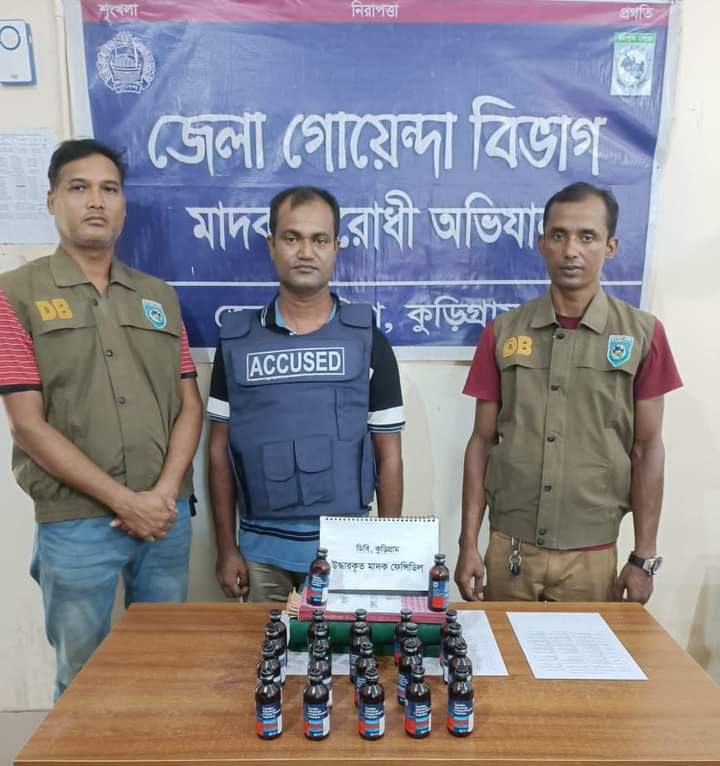 শুক্রবার, ২৩ আগষ্ট ২০২৪ ইং। কুড়িগ্রাম জেলা গোয়েন্দা শাখা (ডিবি) পুলিশের একটি চৌকস টিম অদ্য ২৩ আগস্ট ২০২৪ দুপুর আনুমানিক ১২:৩০ ঘটিকায় গোপন সংবাদের ভিত্তিতে কুড়িগ্রাম সদরের কেতারমোড় টু উলিপুর রোডে ধাওয়া করে উলিপুর থানাধীন পাঁচপীর এলাকায় একটি মোটরসাইকেলযোগে মাদক পরিবহনের সময় ২২ বোতল ফেন্সিডিল সহ পূর্বের ৫ টি মাদক মামলার আসামী কুড়িগ্রামের নাগেশ্বরী দক্ষিণ রামখানা এলাকার শ্রী স্বপন কুমার দাস (৪০) কে হাতেনাতে গ্রেফতার করে। এ সময় মাদক পরিবহনে ব্যবহৃত মোটরসাইকেলটি জব্দ করে পুলিশ।