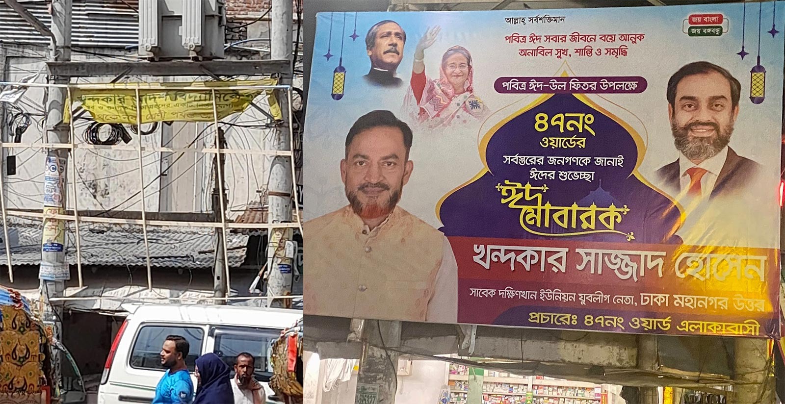 নিজস্ব প্রতিবেদক : আসন্ন ঈদুল ফিতর উপলক্ষে ঢাকা উত্তর সিটি কর্পোরেশনের ৪৭ নং ওয়ার্ড বাসীকে শুভেচ্ছা জানিয়ে ব্যানার ও ফেস্টুন লাগান সাবেক যুবলীগ নেতা খন্দকার সাজ্জাদ হোসেন। তবে ব্যানার ও ফেস্টুন লাগানোর পরে তা ছিড়ে ফেলেছে দুষ্কৃতিকারীরা।