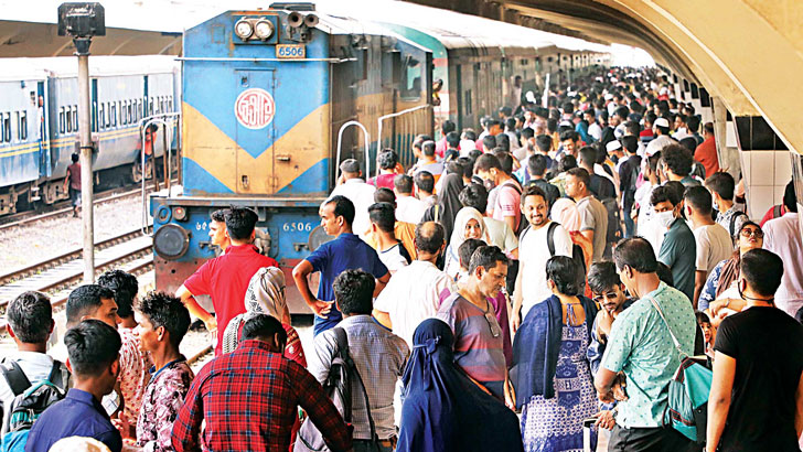 ট্রেনে ঈদযাত্রার তৃতীয় দিনে কমলাপুর রেলওয়ে স্টেশনে যাত্রীদের উপচেপড়া ভিড় দেখা গেছে। ঈদযাত্রায় যাত্রী চাপ সামাল দিতে আজ থেকে যুক্ত হয়েছে ৮ জোড়া বিশেষ ট্রেন।
