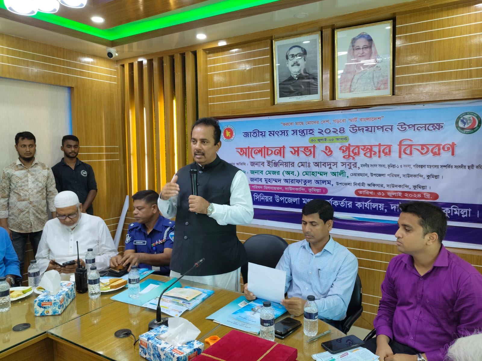 “ভরবো মাছে মোদের দেশ, গড়বো মোড়া স্মার্ট বাংলাদেশ” এই প্রতিপাদ্য বিষয়টি সামনে রেখে দাউদকান্দিতে জাতীয় মৎস সপ্তাহ-২০২৪ উদযাপন করা হয়েছে। বুধবার (৩১ জুলাই) সকাল সাড়ে ১১টায় কুমিল্লা জেলার দাউদকান্দি উপজেলা পরিষদের সভাকক্ষে এ উপলক্ষে এক আলোচনা সভা অনুষ্ঠিত হয়। এতে প্রধান অতিথি হিসেবে উপস্থিত ছিলেন কুমিল্লা-১ আসনের সাংসদ ইঞ্জিনিয়ার মোঃ আব্দুস সবুর। দাউদকান্দি উপজেলা নির্বাহী কর্মকর্তা মুহাম্মদ আরাফাতুল আলমের সভাপতিত্বে আরও উপস্থিত ছিলেন—ড. আব্দুল মান্নান জয়, উপজেলা সহকারী কমিশনার (ভূমি) মো. জিয়াউর রহমান, সিনিয়র উপজেলা মৎস কর্মকর্তা সাবিনা ইয়াসমিন চৌধুরী, কুমিল্লা উত্তর জেলা স্বেচ্ছাসেবক লীগের সভাপতি জিএস সুমন সরকার, সদর উত্তর ইউনিয়নের চেয়ারম্যান কামরুজ্জামান শাহীন, পৌরসভা প্যানেল মেয়র রকিবউদ্দীন রকিব প্রমুখ।