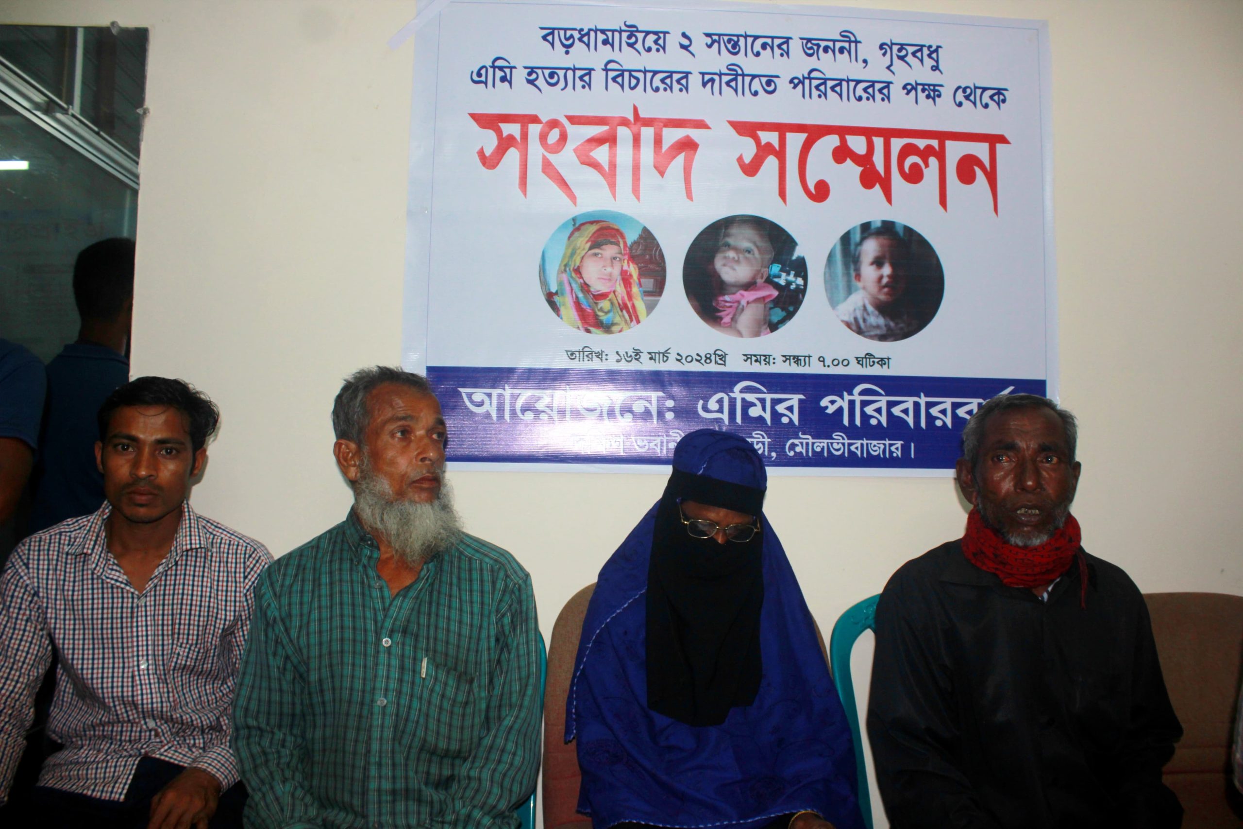 এভাবে বিগত ৮ মাস চলার পর গত ৭ মার্চ রোজ বৃহস্পতিবার সন্ধ্যা আনুমানিক ৭ ঘটিকার সময় এমির স্বামী জাবেদ মিয়া ফোন করে বলে আমার মেয়ে খুবই অসুস্থ। জুড়ী সরকারি হাসপাতালে নিয়ে এসেছি আপনি এসে দেখে যান। ফোন পাওয়ার সাথে সাথে আমি আমার ছেলে ইমনকে সাথে করে নিয়ে হাসপাতালে গিয়ে দেখি হাসপাতালের সিটে মৃত আবস্থায় আমার মেয়ে পড়ে আছে। কর্তব্যরত চিকিৎসকগন তাৎক্ষনিক ভাবে এমিকে মৃত ঘোষনা করেন। এসময় হাসপাতালে গিয়ে দেখি জাবেদ পালিয়ে যায়। পাশে শুধু জাবেদের এক ছোটবোন ছিল। এসময় কর্তব্যরত চিকিৎসক থানায় ফোন করে বিষয়টি জানালে পুলিশ হাসপাতাল থেকে আমার মেয়ে এমিকে মৃত অবস্থায় উদ্ধার করে ময়না তদন্তের জন্য মৌলভীবাজার সরকারী হাসপাতাল মর্গে প্রেরন করে। এ ঘটনা জুড়ী থানায় একটি অপমৃত্যু মামলা নং-০৬, জিডি নং-৩১৩, তারিখ ০৭/০৩/২০২৪ইং করা হয়। ঘটনার পর থেকেই এমির স্বামী জাবেদ পলাতক রয়েছে। আমার মেয়ের জানাজার নামাজেও সে থাকে নি। জাবেদের নির্যাতনে আমার মেয়ে মারা গেছে। মৃত অবস্থায় আমার মেয়ের আমি আপনাদের মাধ্যমে আমার মেযে ২ সন্তানের জননীর হত্যার বিচার চাই। আমার মেয়ে হত্যার সাথে সংশ্লিষ্ঠ সকল অপরাধীদের গ্রেফতার করিয়ে আইনের আওতায় এনে সুষ্ঠ বিচার কামনা করছি।