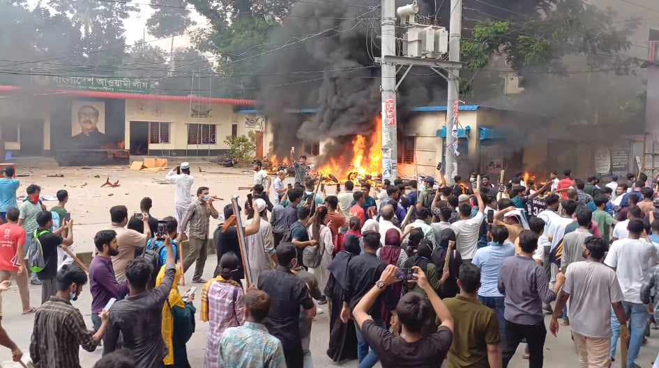ফরিদপুরে আগুন দেওয়া হয়েছে জেলা আওয়ামী লীগ ও ছাত্রলীগের কার্যালয়ে। পরে আন্দোলনকারীরা আওয়ামী লীগ কার্যালয়ের সামনে অবস্থিত আটটি মোটরসাইকেলেও আগুন ধরিয়ে দেয়।