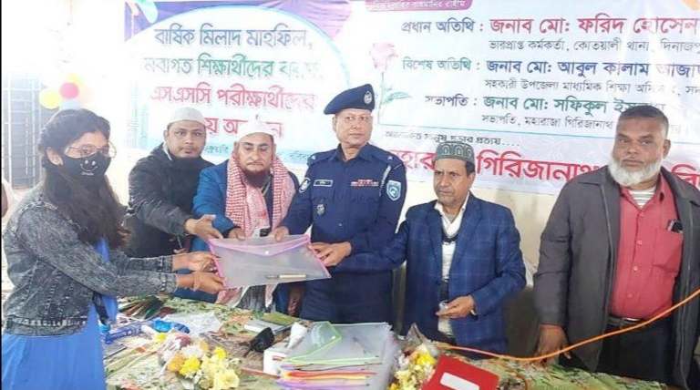 মোঃ জাহিদ হোসেন দিনাজপুর প্রতিনিধি: দিনাজপুরে ঐতিহ্যবাহী মহারাজা গিরিজানাথ উচ্চ বিদ্যালয়ে নবাগত পরীক্ষাথীদের বিদায় অনুষ্ঠিত হয়েছে । এর আগে বার্ষিক মিলাদ মাহফিলের আয়োজন ছিল। গত রোববার সকালে মহারাজা গিরিজানাথ উচ্চ বিদ্যালয়ের হলরুমে উক্ত বার্ষিক মিলাদ মাহফিল , নবাগত শিক্ষার্থীদের বরণ ও এসএসসি পরীক্ষাথীদের বিদায় অনুষ্ঠিত হয়। অত্র বিদ্যালয় পরিচালনা কমিটির সভাপতি মোঃ সফিকুল ইসলাম বাবলু এর সভাপতিত্বে অনুষ্ঠানে প্রধান অতিথি বক্তব্য রাখেন দিনাজপুর কোতয়ালি থানার ভারপ্রাপ্ত কর্মকর্তা (ওসি) মোঃ ফরিদ হোসেন।