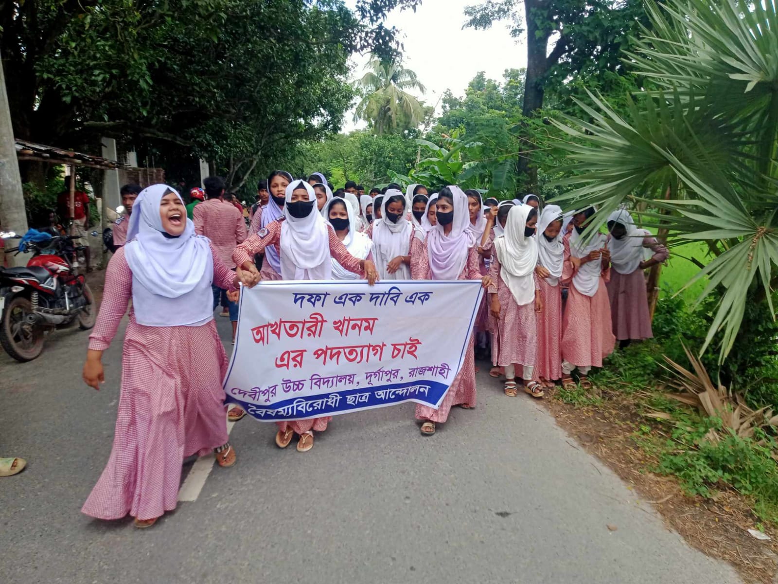 রাজশাহীর দুর্গাপুরে দেবিপুর উচ্চ বিদ্যালয়ের প্রধান শিক্ষিকা আখতারী খানমের পদত্যাগ, দাবীতে সড়ক অবরোধ করে বিক্ষোভ মিছিল নিয়ে উপজেলা পরিষদে নির্বাহী কর্মকর্তা বরাবর লিখিত অভিযোগ দায়ের করেছেন শিক্ষার্থীরা। ২৫ আগষ্ট রবিবার সকাল ১০ টা থেকে শিক্ষার্থীদের আন্দোলন শুরু হয়ে স্কুল প্রসঙ্গে দীর্ঘসময় বিক্ষোভ শেষ মিছিল নিয়ে উপজেলা পরিষদে যায় দেবিপুর উচ্চ বিদ্যালয়ের শিক্ষার্থীরা। তারা জানায়, প্রধান শিক্ষিকা নানা ধরনের দুর্নীতির সাথে জড়িত, মাঠ সংস্কারের নামে একাধিকবার বরাদ্দ নিয়েও মাঠ সংস্কার হয়নি, স্কুলের কোন টিউবওয়েল নেই, টয়লেট নেই, কোনো ফ্যান ছিলোনা আন্দোলনের মুখে গত রাতে লাগিয়েছে। স্কুলের কম্পিউটার তার ছেলে ব্যাবহার করে। স্কুলের কোনো ফান্ড নেই বিদুৎ বিল চাঁদা তুলে দিতে হয়।