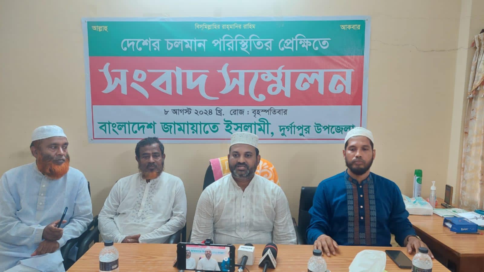 দেশের চলমান পরিস্থিতিতে সবাইকে শান্ত ও সৌহার্দ্য বজায় রাখার দাবিত সংবাদ সম্মেলন করেছেন জামায়াতে ইসলাম বাংলাদেশ রাজশাহীর দুর্গাপুর উপজেলা শাখার নেতৃবৃন্দরা।বৃহস্পতিবার (৮ আগস্ট) দুপুরে জামায়াতে ইসলামের উদ্যোগে দুর্গাপুর পৌর সদরের একটি ব্যবসায়িক কার্যালয়ে এ সম্মেলন অনুষ্টিত হয়।উপজেলা জামায়াতের আমির সাইফুল ইসলামের সঞ্চালনায় সম্মেলনে বক্তব্য রাখেন জেলা জামায়াতের সহকারী সেক্রেটারী নুরুজ্জামান লিটন।তিনি শুরুতেই দেশে চলমান অস্বস্তিকর পরিস্থিতি থেকে পরিত্রাণ পাওয়ায় সৃষ্টিকর্তার শুকরিয়া আদায় করে বলেন, সবাই জানেন দেশে যখনই যে শাসক গোষ্ঠী এসেছে, তারা গণতন্ত্রের মোড়কে স্বৈরশাসন প্রতিষ্টা করেছে। আমরা গত তিনটি সাধারণ নির্বাচনে ভোটাধিকার প্রয়োগ করতে পারি নি। এতে দেশের আপমোর জনতা ও ছাত্র সমাজ সংক্ষুদ্ধ ছিল। ফলে এটার চুড়ান্ত বিস্ফোরণ ঘটেছে। জণগনের বিজয় হয়েছে। লিটিন বলেন, শুরু থেকেই শাসক গোষ্ঠী ছাত্রদের দাবিগুলো খাটো করে দেখেছে শাসক গোষ্ঠী সরকার পক্ষ। ছাত্রদের দাবি গুলো নিয়ে তারা কটুক্তি করেছে। এতে ছাত্রদের সঙ্গে দেশের আপমোর জনতা বিক্ষুদ্ধ হয়ে উঠে। এতে একটি স্বৈরাচার সরকারের পতন হয়েছে। তিনি দেশবাসীর উদ্দেশ্যে বলেন, বাংলাদেশ জামায়াত ইসলাম সব সময় গণতান্ত্রের পক্ষে ছিল এখনও আছে। গণতন্ত্রের অধিকার আদায়ের সংগ্রামে আমাদের হাজার হাজার নেতাকর্মী কারা বরণ করতে হয়েছে। অনেকেই শাহাদত বরণ করেছেন। নেতাকর্মী বিরুদ্ধে অংসখ্য নাশকতা গায়েবী মামলা হয়েছে। লিটন বলেন, আমাদের ওপর যারা অত্যাচার নিপীড়ন করেছেন। তাদের আমরা ক্ষমা করে দিতে চাই। আল্লাহ ও আল্লাহর রাসূল ক্ষমা পছন্দ করেন। তাই আমরা কোন প্রতিশোধ নিব না। বরং সুন্দর বাংলাদেশ প্রতিষ্ঠায় আমাদের সংগ্রাম চলবেই।সাংবাদিকদের এক প্রশ্নের জবাবে লিটন বলেন, আমরা জামায়াত ইসলাম হিংসা বিদ্বেষ চাই না। সরকার পতনের পর যারা দেশে অরাজকতা সৃষ্টি করছেন, রাষ্ট্রীয় সম্পদ ধ্বংস করছেন, তারা অপরাধী। তাদের বিরুদ্ধে কঠোর আইনগত ব্যবস্থা নিতে হবে।লিটন বলেন, আমরা জামায়াত ইসলাম সংখ্যালঘু দের পাশে আছি। ইতিমধ্যে পৌর শহরের সংখ্যালঘু ব্যবসায়ীদের নিরাপত্তা নিশ্চিতে তাদের নিয়ে বৈঠক করেছে জামায়াত ইসলাম। আমরা মসজিদ, মন্দির, প্যাগোডা, গীর্জাসহ অন্যান্য ধর্মালম্বীদের উপসনালয়গুলোর সুরক্ষা চাই। ইতিমধ্যে আমাদের উপজেলার আড়ইল গ্রামে একটি মন্দির জামায়াতের নেতাকর্মীরা নিরাপত্তায় পাহারা দিচ্ছেন। সংবাদ সম্মেলন উপস্থিত ছিলেন, উপজেলা জামায়াতের সেক্রেটারী শিক্ষক শামীম উদ্দিন, পৌর জামায়াতের আমীর মাওনা রফিকুল ইসলাম, সেক্রেটারী শাহিনুল ইসলাম, উপজেলা জামায়াতে সাবেক আমীর ফজলুল বারী সোহর