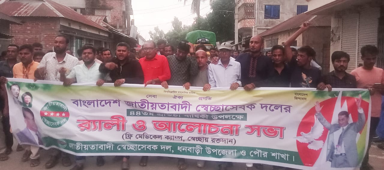 ধনবাড়ীতে সেচ্ছাসেবক দলের 88 তম প্রতিষ্ঠা বার্ষিকী পালিত হয়েছে।উপজেলা সেচ্ছাসেবক দলের সভাপতি আনোয়ার হোসেন লেবুর সভাপতিত্বে ,প্রধান অতিথি হিসেবে উপস্হিত ছিলেন ধনবাড়ী উপজেলা বিএনপির সংগ্রামী সভাপতি জননেতা এম আজিজুর রহমান,আরও.উপস্তিত ছিলেন সংগ্রামী সহ সভাপতি জননেতা হাফেজ মোঃ খাইরুল ইসলাম, সাধারন সম্পাদক এনামুল হক ভিপি, ধনবাড়ী পৌর বিএনপির সভাপতি ধনবাড়ী কলেজের সাবেক জি,এস ,জননেতা এস এম ছোবহান ,সাধারন সম্পাদক ত্যাগি ও রাজপথ কাপানো জনপ্রিয় জননেতা মোঃ রফিকুল ইসলাম স্বপন।যুগ্ন সাধারন সম্পাদক জনপ্রিয় জনন্দিত জননেতা মোঃ জাহিদুল ইসলাম মহব্বত।এসময় আরো উপস্তিত ছিলেন উপজেলা যুবদলের সিঃ যুগ্ন আহবায়ক মোঃ শাহরিয়ার সুমন,উক্ত অনুষ্ঠান উপস্হাপনা করেন উপজেলা সেচ্ছাসেবক দলের সাধারন সম্পাদক মোঃ রাশিদুল হাসান প্লাবন, আরও উপস্হিত ছিলেন ,পৌর সেচ্ছাসেবক দলের সভাপতি আশরাফুল ইসলাম সোহেল , সাধারন সম্পাদক,হাবিবুর রহমান হবি, উপজেলা ছাত্রদল নেতা মোঃ সাইফুল ইসলাম সজিব সহ আরো অনেক নেতৃবৃন্দ উপস্তিত ছিলেন। উক্তঅনুষ্ঠানে অতিথি গন খুবই গুরত্বপুর্ন দিক নির্দেশনা মুলক বক্তব্য রাখেন। এবং সকল নেতাকর্মীদের নিষ্ঠার সাথে কাজ করে যেতে বলেন।