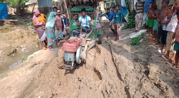 নওগাঁ পোরশা উপজেলার তেঁতুলিয়া ইউনিয়নে দীঘি পাড়া গ্রামবাসীর চলাচলের একমাত্র রাস্তাটির বেহাল দশা। খরা মৌসুমে ওরে ধুলো আর বর্ষা মৌসুমে হয়ে যায় হাঁটু পরিমাণ কাদা। ভোগান্তিতে কয়েক হাজার মানুষ। গ্রামটির পূর্বে একটি বাজার, উত্তরে ও দক্ষিণে গ্রামটি সম্প্রসারিত হয়ে গেছে, পশ্চিম পাশে কয়েক হাজার বিঘা জমি, বাজার থেকে গ্রামের মুখে এসে পাকা থেমে গেছেন, মাঝে দেড় কিলোমিটার কাঁচা রাস্তাটি এখনো পাকা হয়নি। ওই রাস্তাটি প্রতিদিন প্রায় ৪-৫ শত মানুষের চলাচলের একমাত্র মাধ্যম বলে জানান এলাকাবাসী মাওলানা ইসাহাক আলী।একটু বৃষ্টি হলেই রাস্তাটি দেখে মনে হয় হাল চাষ করার জমি। কর্দমাক্ত রাস্তা দিয়ে চলাচলে এলাকাবাসীকে সীমাহীন দুর্ভোগ পোহাতে হচ্ছে। স্কুল কলেজ ও মাদ্রাসার ছাত্র ছাত্রী সহ শিশু শিক্ষার্থী ও পথচারী এবং মসজিদের মুসল্লিদের চলাচলে দুর্ভোগের শেষ নেই। তাছাড়া খরা মৌসুমে এই রাস্তা দিয়ে হাজার হাজার মন ধান ও আম বহন করতে চলাচল করে ট্রাক্টর, ভ্যান ও পাওয়ার টিলার।এ ব্যাপারে নজরুল ইসলাম বলেন, বাজার থেকে এক বস্তা চাউল নিয়ে ভ্যান ভাড়া করতে চাইলে পাঁচ টাকার ভাড়া নিতে চায় দুই থেকে তিনশত টাকা, আবার কখনো কখনো আসতেই চান না যানবাহন চালকেরা।কোথাও রাস্তা ভেঙ্গে পুকুরের সঙ্গে মিশে গেছে বলে দেখা যায়।মাওলানা আব্দুল কুদ্দুস বলেন, এ গ্রামে কোন মানুষ মারা গেলে লাশ বহন করে কবরস্থানে নিতে পড়তে হয় চরম বিপদে। অপরদিকে কোন প্রসূতি বা রোগী বহন করে হাসপাতালে নেওয়াও যেন কষ্টকর হয়ে পড়ে তাদের। বর্ষাকালে হাঁটুর উপর কাপড় তুলে জুতা হাতে নিয়ে চলতে হয় পথচারীদের। ধূলোর সৃষ্টি হয়ে একই পরিস্থিতির শিকার হতে হয় খরা কালেও। বর্ষাকালে পিছলে পড়ে গিয়ে কাপড় নষ্ট হয়ে স্কুলে যাওয়া হয় না অনেক শিক্ষার্থীর।তেঁতুলিয়া ইউনিয়ন চেয়ারম্যান ফজলুল হক শাহ বলেন, মাত্র দেড় কিলোমিটার রাস্তাটি পাকা না হওয়ায় দীর্ঘদিন দূর্ভোগে চলাচল করতে হচ্ছে এলাকাবাসীর। তারা এই রাস্তা দিয়েই মাঠ থেকে জমির ফসল ঘরে তোলেন। এ ছাড়া স্থানীয় বাজারে নিত্য প্রয়োজনীয় খাদ্য ও পণ্যসামগ্রী কেনাকাটা করতে যাতায়াত করতে হয় এলাকাবাসীকে। জনদূর্ভোগ ও বিড়ম্বনার অবসান ঘটাতে রাস্তাটি পাকা করা প্রয়োজন। তিনি রাস্তাটি পাকা করার জন্য সংশ্লিষ্ট কর্তৃপক্ষের হস্তক্ষেপ কামনা করেন। জানা যায়, জনপ্রতিনিধির কাছে দীর্ঘদিন ধরে রাস্তাটি পাকা করণের দাবি জানিয়ে আসছে এলাকাবাসী। বারংবার প্রতিশ্রুতি দিলেও রাস্তাটি যেন কোথাও আটকে রয়েছেন । দীর্ঘ ১৫ বছর ধরে দুর্ভোগ পোহাচ্ছেন বলে জানালেন ১ গ্রামবাসী।এ বিষয়ে পোরশা এলজিইডি নির্বাহী প্রকৌশলী বলেন, রাস্তাটি সম্পর্কে অবগত হয়েছি। রাস্তাটি এলাকা বাসীর চলাচলের জন