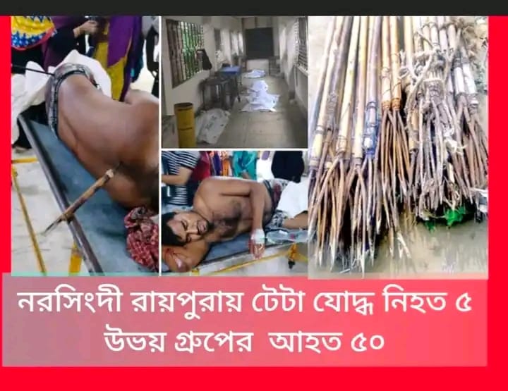 নরসিংদীর রায়পুরায় আধিপত্য বিস্তার নিয়ে দু’গ্রুপের সংঘর্ষে টেঁটা ও গুলিবিদ্ধ হয়ে নারীসহ পাঁচজন নিহত হয়েছেন । এতে উভয়পক্ষের ২০-২৫ আহত হয়েছেন। আহতরা উপজেলা ও নরসিংদী সদর হাসপাতালে চিকিৎসাধীন। গত বুধবার রাতে ও বৃহস্পতিবার সকালে উপজেলার শ্রীনগর ইউনিয়নের সায়দাবাদ ও বালুচর এলাকায় দু’গ্রুপের মধ্যে এ সংঘর্ষের ঘটনা ঘটে। নিহতরা হলেন- রায়পুরা উপজেলার শ্রীনগর ইউনিয়নের সায়দাবাদ এলাকার ইসমাঈল হোসেন ব্যাপারীর দুই ছেলে আমির হোসেন (৭০) ও বাদল মিয়া (৪৫), আব্বাস আলীর ছেলে আনিছ মিয়া (২৫), শাহীন মিয়ার ছেলে মোস্তাকিম জুনায়েদ (১৬) ও একই ইউনিয়নের বাঘাইকান্দি এলাকার শাহাবুদ্দিনের স্ত্রী ফিরোজা বেগম (৩৫)। নিহতরা সবাই ফিরোজ মিয়ার অনুসারী। পুলিশ ও স্থানীয় সূত্র জানায়, দু’পক্ষের মধ্যে একটির নেতৃত্বে আছেন রায়পুরার আবু হানিফ জাকারিয়া (হানিফ মাস্টার) ও অন্যটির নেতৃৃত্বে আছেন শ্রীনগরের ফিরোজ মেম্বার। এলাকায় আধিপত্য বিস্তার নিয়ে পাঁচ বছর ধরে দু’পক্ষের মধ্যে বিরোধ চলে আসছিল।