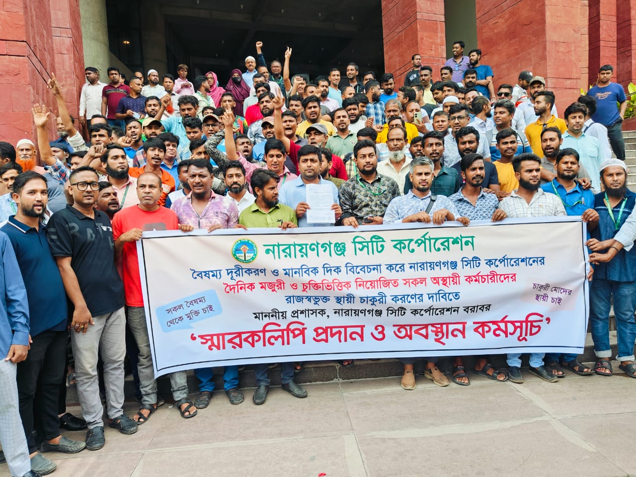 দৈনিক মজুরি ও চুক্তি ভিত্তিক নিয়োজিত সকল অস্থায়ী কর্মচারীদের স্থায়ী করার জন্য নারায়ণগঞ্জ সিটি করপোরেশন(নাসিক) বরাবর স্মারকলিপি প্রদান এবং অবস্থান কর্মসূচী পালন করেন নাসিক কর্মচারী বৃন্দ।গতকাল ২৫ আগষ্ট (রবিবার) দুপুর ১২ টার সময় সিটি করপোরেশনের প্রশাসক এ এইচ এম কামরুজ্জামান এর নিকট স্মারকলিপি প্রদান করা হয়।