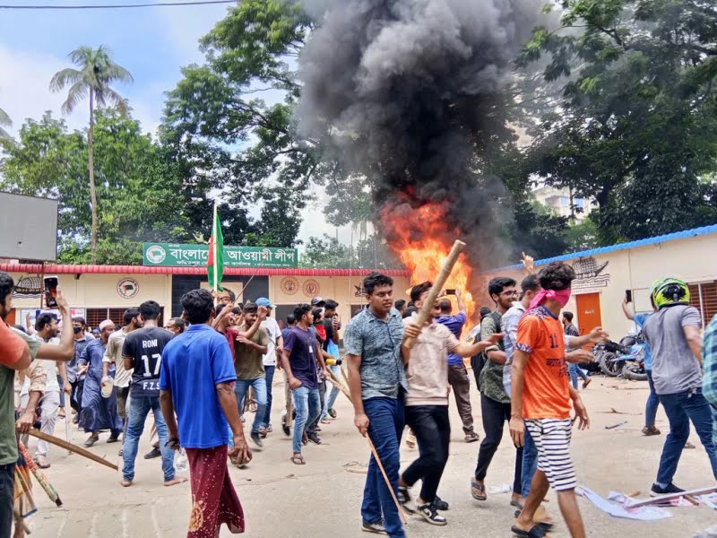 সেখান থেকে বিক্ষোভকারীরা জেলা আওয়ামী লীগ কার্যালয়ে এলে আওয়ামী লীগের নেতা–কর্মীরা ইটপাটকেল ছুড়তে থাকে। তবে বিক্ষোভকারীদের তোপের মুখে আওয়ামী লীগ কার্যালয় থেকে পালিয়ে যায় অবস্থানরত নেতা–কর্মীরা। এ সময় বিক্ষোভকারীরা আওয়ামী লীগের কার্যালয় ভাঙচুর চালাতে থাকে। পরে কার্যালয় চত্বরে রাখা ২০-৩০টি মোটরসাইকেলে আগুন ধরিয়ে দেওয়ার পাশাপাশি কার্যালয়েও আগুন দেয় তারা। এ সময় এক আওয়ামী লীগের এক কর্মীকে পেটান আন্দোলনকারীরা।