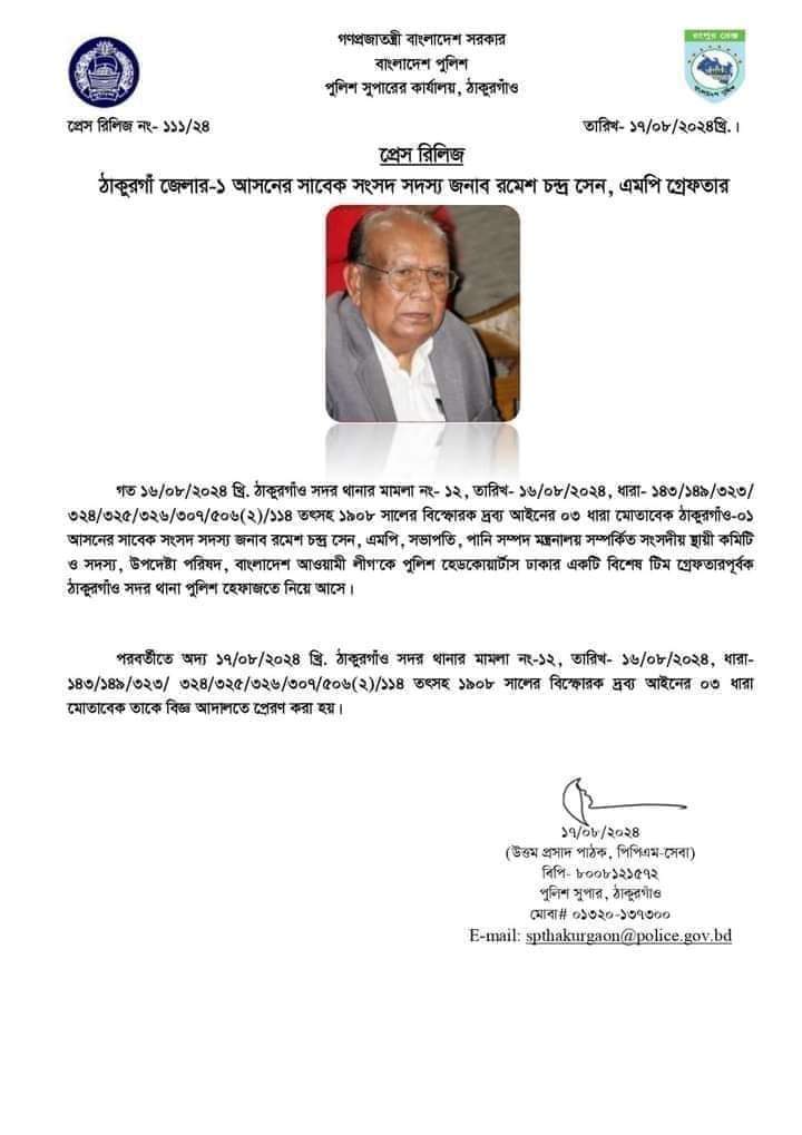 এই মামলায় শনিবার বিকেল সাড়ে তিনটায় সাবেক এমপিকে রমেশ চন্দ্র সেনকে আদালতে তোলা হলে জুডিশিয়াল ম্যা-জিষ্ট্রেট কোর্টের বিচারিক রাজিব কুমার রায় তাকে কারাগারে পাঠানোর নির্দেশ দেন। মামলাটি দায়ের করেন ঠাকুরগাঁও হাজীপাড়ার স্থানীয় বাসিন্দা রিপন নামে এক ব্যক্তি।পুলিশ জানায়, তিনি অসুস্থ্য থাকায় রিমান্ড চাওয়া হয়নি পরবর্তীতে রিমান্ডের আবেদন করা হবে।এর আগে শুক্রবার রাতে সাদা পোশাকে পুলিশের একদল সদস্য সাবেক এপি রমেশ চন্দ্র সেনকে তার নিজ বাসভবন রুহিয়া থেকে আটক করে। তিনি আওয়ামীলীগের সাবেক প্রেসিডিয়াম সদস্য, সাবেক পানি সম্পদ মন্ত্রী ও আওয়ামী লীগের উপদেষ্টা মন্ডলীর সদস্য ছিলেন।আ*টকের সময় রমেশ চন্দ্র সেনের স্ত্রী অঞ্জলি সেন অভিযোগ করে বলেন, সাদা পোশাকে পুলিশের ১০-১৫ জনের একটি দল এসে তাকে তুলে নিয়ে যায়। তারা গোয়েন্দা পুলিশের (ডিবি) সদস্য হতে পারেন। রমেশকে কোথায় নিয়ে যাওয়া হচ্ছে এ বিষয়ে কিছু বলেন নি তারা।অঞ্জলি সেন' আরও জানান, সবার কাছে অস্ত্র ছিল। রমেশকে তারা বলেন, ওঠেন আমাদের সাথে চলেন। তারা হাত ধরে জোর করে টেনে নিয়ে চলে যায়। কোথায় নিয়ে যাবেন বারবার জিজ্ঞেস করেছি, কিন্তু তারা কিছু বলেনি৷এ বিষয়ে সদর থানার ওসি এবিএম ফিরোজ ওয়াহিদ জানান, সাবেক এমপি রমেশ চন্দ্র সেনকে আটকের ফর গ্রেফতার দেখানো হয়েছে কারণ তার বিরুদ্ধে বিস্ফোরক দ্রব্য আইনে মামলা হয়েছে।তথ্য, গত ১৬/০৮/০২৪ খ্রি. ঠাকুরগাঁও সদর থানার মামলা নং-১২, তারিখ- ১৬/০৮/২০২৪, ধারা- ১৪৩/১৪৯/৩২৩/৩২৪/৩২৫/৩২৬/৩০৭/৫০৬(২)/১১৪ তৎসহ ১৯০৮ সালের বিস্ফোরক দ্রব্য আইনের ০৩ ধারা মোতাবেক ঠাকুরগাঁও -০১ আসনের সাবেক সংসদ সদস্য জনাব রমেশ চন্দ্র সেন, এমপি, সভাপতি, পানি সম্পদ মন্ত্রনালয় সম্পর্কিত সংসদীয় স্থায়ী কমিটি ও সদস্য, উপদেষ্টা পরিষদ, বাংলাদেশ আওয়ামী লীগ’কে পুলিশ হেডকোয়ার্টাস ঢাকার একটি বিশেষ টিম গ্রেফতারপূর্বক ঠাকুরগাঁও সদর থানা পুলিশ হেফাজতে নিয়ে আসে।পরবর্তীতে অদ্য ১৭/০৮/২০২৪ খ্রি. ঠাকুরগাঁ সদর থানার মামলা নং-১২, তারিখ- ১৬/০৮/২০২৪, ধারা- ১৪৩/১৪৯/৩২৩/৩২৪/৩২৫/৩২৬/৩০৭/৫০৬(২)/১১৪ তৎসহ ১৯০৮ সালের বিস্ফোরক দ্রব্য আইনের ০৩ ধারা মোতাবেক তাকে বিজ্ঞ আদালতে প্রেরণ করা হয়