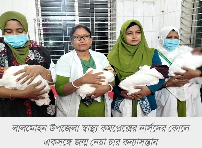রোববার রাত ১০টায় লালমোহন উপজেলা স্বাস্থ্য কমপ্লেক্সে একে একে চার কন্যাশিশুর জন্ম দেন প্রসূতি মা সালমা বেগম। তিনি উপজেলার কালমা ইউনিয়নের লেজ ছকিনা এলাকার আজিম উদ্দিন হাওলাদার বাড়ির মো. জুয়েলের স্ত্রী। তাদের দুই বছরের আরো একজন ছেলে রয়েছে। এ বিষয়ে লালমোহন উপজেলা স্বাস্থ্য কমপ্লেক্সের মেডিকেল অফিসার ডা. অতনু মজুমদার জানান, সন্ধ্যার পর সালমা নামের একজন গর্ভবতী মা হাসপাতালে আসেন। আসার পর আমাদের নার্স এবং মিডওয়াইফরা দক্ষতার সঙ্গে তার সন্তান প্রসব করান। এ সময় ঐ নারী একে একে চার সন্তানের জন্ম দেন। সন্তান প্রসবের পর মা সুস্থ থাকলেও নবজাতক শিশুদের শারীরিক জটিলতা থাকায় উন্নত চিকিৎসার জন্য তাদের ভোলা সদর হাসপাতালে রেফার্ড করা হয়েছে।