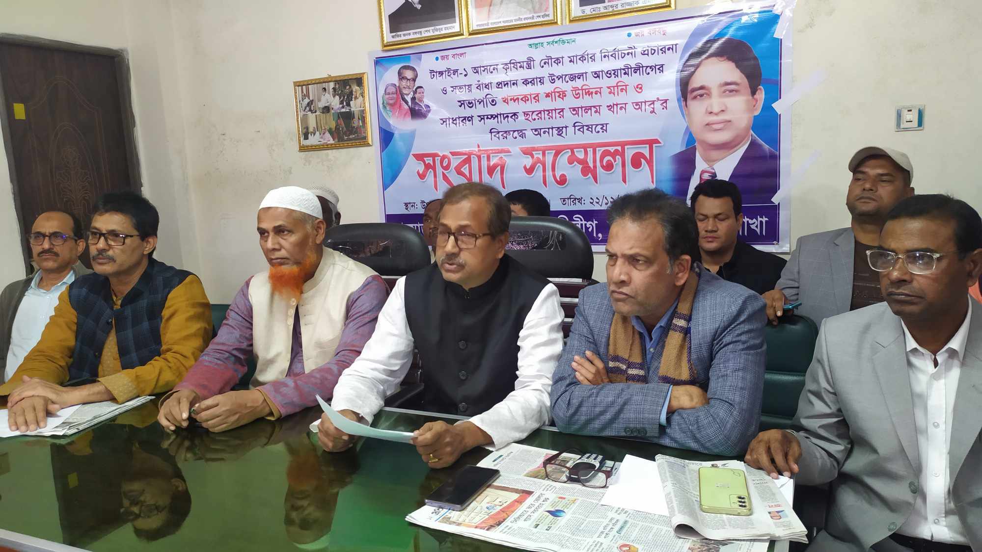 সংবাদ সম্মেলনে লিখিত বক্তব্য পাঠ করেন উপজেলা আওয়ামীলীগের ভারপ্রাপ্ত সভাপতি ও নির্বাচন পরিচালনা কমিটির আহবায়ক এডভোকেট ইয়াকুব আলী। লিখিত বক্তব্যে তিনি সাংবাদিকদের জানান, নির্বাচন পরিচালনার জন্য বিভিন্ন ইউনিয়নের কেন্দ্র কমিটি গঠন করা হচ্ছে। এরই ধারাবাহিকতায়( ১৭ ডিসেম্বর) রবিবার উপজেলার গোলাবাড়ি ইউনিয়নের হাসনই এলাকায় কেন্দ্র কমিটি গঠন করার সময় মঞ্চ ভাংচুর এবং দলীয় নেতা কর্মীদের উপর উপজেলা আওয়ামী লীগের সাধারণ সম্পাদক ছরোয়ার আলম খান আবু এর লোকজন অতর্কিত হামলা চালায় এতে কয়েকজন নেতা কর্মী আহত হন। তিনি আরও জানান ছরোযার আলম খান আবু ক্ষমতার অপব্যবহার, স্বেচ্ছাচারিতা ও স্বৈরাচারীতার মাধ্যমে দলের ভাবমূর্তি ক্ষুণ্ন করছেন। নির্বাচনী প্রচারনায় বিভিন্ন স্হানে তার অনুসারীরা বাধা প্রদান করে আসছেন যা নির্বাচনের ব্যাপকক্ষতি হচ্ছে বলেও উল্লেখ করেন। এর পরিপ্রেক্ষিতে দলীয় কার্যালয়ে উপজেলা আওয়ামীলীগের কার্যনির্বাহী কমিটি এক জরুরি আলোচনা সভার আয়োজন করেন। উক্ত সভায় ৪১বিশিষ্ট কার্যকরী কমিটির সদস্যদের সর্বসম্মতিক্রমে উপজেলা আওয়ামী লীগের সভাপতি খন্দকার শফিউদ্দিন মনি, সাধারণ সম্পাদক ছরোয়ার আলম খান আবু, সাংগঠনিক সম্পাদক গোলাম মোস্তফা খান বাবলু ও শিক্ষা ও সাংস্কৃতিক বিষয়ক সম্পাদক সামছুল আরেফিন শরিফকে অনাস্হা প্রধান করা হয়। অনাস্হা প্রস্তাব রেজুলেশন আকারে টাঙ্গাইল জেলা কমিটির নিকট প্রেরন করা হবে বলে সাংবাদিকদের জানান।
