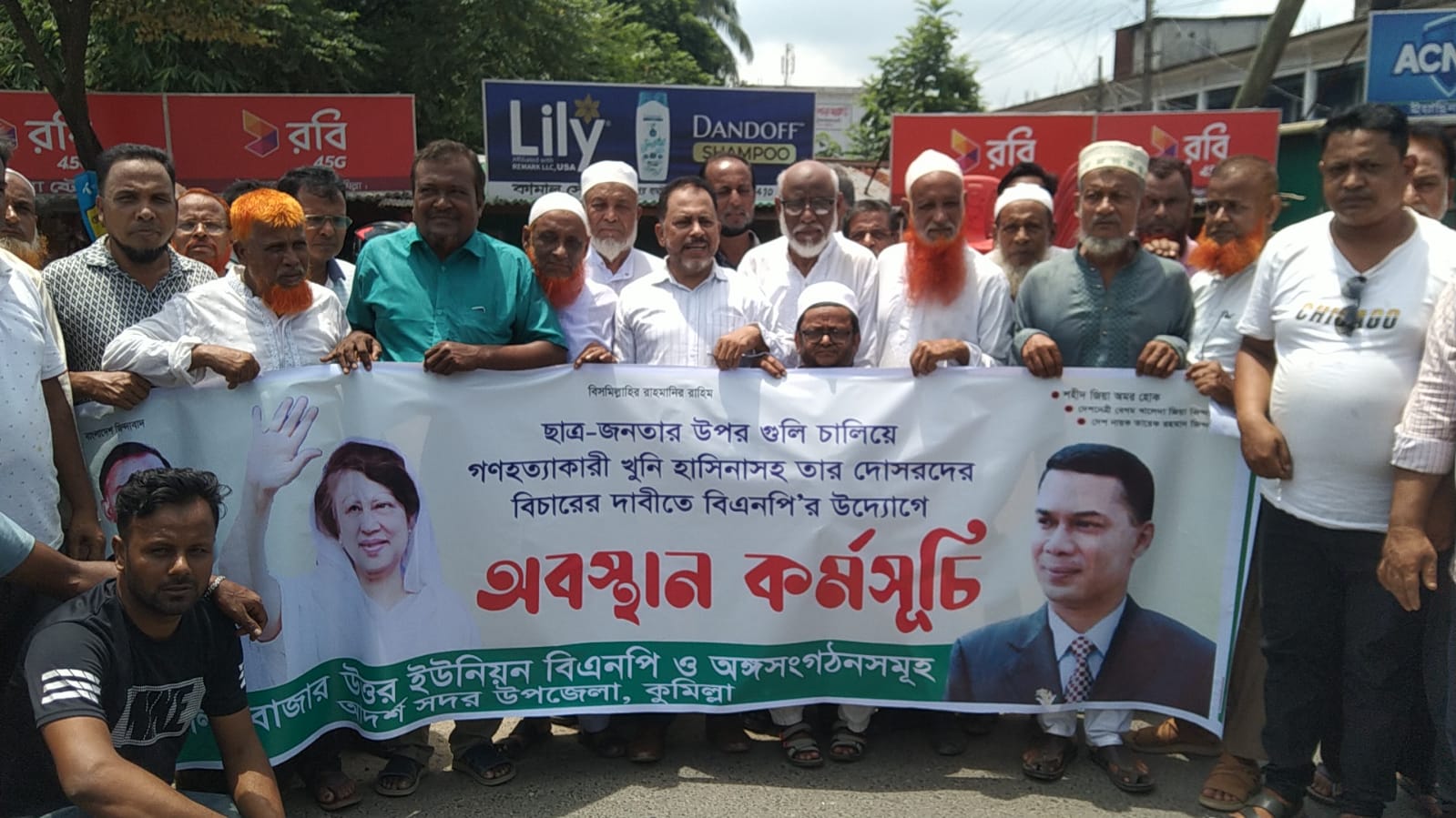 গতকাল ১৫ ই আগষ্ট সকাল থেকে কুমিল্লা সদরের কালির বাজার ইউনিয়নের ঢাকা চট্টগ্রাম মহাসড়কের সৈয়দপুর বাজারে বিএনপি ও অঙ্গ সংগঠনের নেতাকর্মীরা এই মানববন্ধন করেন।মানববন্ধনে উপস্থিত ছিলেন ১ নং কালির বাজার ইউনিয়ন বিএনপির সভাপতি ফরহাদ হোসেন ভূঁইয়া, সাধারণ সম্পাদক মমিনুল ইসলাম মাষ্টার, আদর্শ সদর উপজেলা বিএনপির সদস্য ওলি মাষ্টার, ১নং কালির বাজার ইউনিয়নের যুগ্ম সাধারণ সম্পাদক হাফেজ কামরুল হাসান, বি এন পি নেতা হেলাল উদ্দিন, মাসুম বিল্লাল। এছাড়াও উপস্থিত ছিলেন সদর উপজেলা যুবদলের সদস্য আব্দুল্লাহ আল মামুন, তরিকুল ইসলাম, ইউনিয়ন যুবদলের সভাপতি মিজানুর রহমান, মোহাম্মদ টিটু, গাজী সুমন সহ কালির বাজার উত্তর ইউনিয়ন বিএনপি ও সহযোগী অঙ্গ সংগঠনের সকল নেতৃবৃন্দ। তারা সকলে সৈয়দপুর বাজার মহাসড়কে সকাল ১০ টার সময় অবস্থান নেন এবং ছাত্র জনতার উপর নির্মম ভাবে গুলি চালানোর প্রতিবাদ ও বিচারের দাবিতে কালির বাজার উত্তর ইউনিয়ন বিএনপির অবস্থান সম্পর্কে জানানদেন। প্রত্যেকের বক্তব্যে তারা খুনি হাসিনা ও তার দোসরদের বিরুদ্ধে আইনি পদক্ষেপ জোরদার ও দ্রুত কার্যকর করার দাবি জানান।