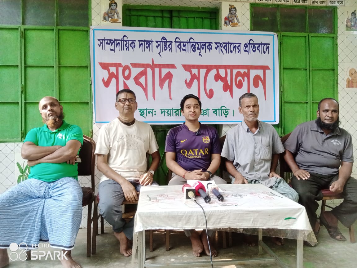 নোয়াখালীর সেনবাগে সাম্প্রদায়িক দাঙ্গা সৃষ্টির বিভ্রান্তিমূলক সংবাদের প্রতিবাদের সংবাদ সম্মেলন অনুষ্ঠিত হয়। মঙ্গলবার (১৩ আগস্ট ) বিকেলে নোয়াখালীর সেনবাগ উপজেলার ৭নং মোহাম্মদপুর ইউনিয়নের ৮নং ওয়ার্ডের উত্তর মোহাম্মদপুর গ্রামের দয়ারাম ভূইয়া বাড়িতে সাম্প্রদায়িক দাঙ্গা সৃষ্টির বিভ্রান্তিমূলক সংবাদ প্রচারের প্রতিবাদের সংবাদ সম্মেলন অনুষ্ঠিত হয়েছে। উক্ত সংবাদ সম্মেলনে দীনেশ চন্দ্র সাহার পুত্র যপন সাহা বলেন, বিগত ৬ আগস্ট ২০২৪ ইং রোজ মঙ্গলবার সন্ধ্যায় লাড়কি ঘরের উইপোকা নিধনের উদ্দেশ্যে আমাদের গ্রামের হোসেন মিয়ার দোকান থেকে প্লাস্টিকের বোতলে করে সাইকেল যোগে কেরোসিন তেল আনার সময় বাড়ির দরজার পাশ দিয়ে যাওয়ার সময় ঝাঁকুনিতে বর্ণিত প্লাস্টিক বোতল থেকে পাশে বসতবাড়ির সদর দরজায় কিছু কেরোসিন অজান্তে পড়লেও পড়তে পারে বলে জানান। বাংলাদেশের বর্তমান বৈষম্য বিরোধী আন্দোলনের প্রেক্ষাপটে কিছু কুচক্রী মহল সম্প্রদায়িক দাঙ্গা সৃষ্টির লক্ষ্যে কেরোসিন পড়াকে কেন্দ্র করে বিভ্রান্তিমূলক সংবাদ প্রচার করে, যাহা সম্পূর্ণ মিথ্যা, বানোয়াট ও উদ্দেশ্য প্রণোদিত। যপন সাহা সংবাদ সম্মেলনে জানান, সাংবাদিক ভাইয়েরা আপনারা দেখেন আমাদের মন্দির সম্পূর্ণ অক্ষত, কোন প্রকার নষ্ট বা আগুনের কোন আলামত নেই। কেরোসিন দিয়ে আগুন লাগিয়ে মন্দির পোড়ানোর সংবাদ প্রচার করে আমাদের ঐতিহ্য সম্বলিত দয়া রাম ভূঁঞা বাড়ির পারিবারিক সুনাম হয়েছে।উক্ত সংবাদ প্রচারে তার ও তার পরিবারের পক্ষ থেকে কাউকে বিভ্রান্ত না হওয়ার জন্য বিশেষভাবে অনুরোধ করছেন।সংবাদ সম্মেলনে আরো উপস্থিত ছিলেন, জুলটন সাহা, শিবু চন্দ্র দেবনাথ ও প্রতিবেশী চৌধুরী মিয়া। তাঁরা জানান, উক্ত বাড়ির পারিবারিক মন্দিরে পূজারীগণ আরাধনা করে থাকেন।