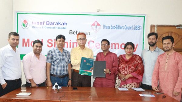 ঢাকা সাব-এডিটরস কাউন্সিল (ডিএসইসি) এবং ইনসাফ বারাকাহ কিডনি অ্যান্ড জেনারেল হাসপাতালের মধ্যে (স্বাস্থ্যসেবা) সমঝোতা চুক্তি স্বাক্ষরিত হয়েছে। মঙ্গলবার এ চুক্তিতে স্বাক্ষর করেন ইনসাফ বারাকাহ হাসপাতালের অ্যাডিশনাল ম্যানেজিং ডিরেক্টর মো. আলতাফ