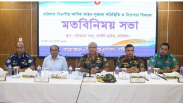 সাব্বির আলম বাবু, বিশেষ প্রতিনিধিঃ বরিশাল বিভাগীয় সার্বিক আইনশৃঙ্খলা পরিস্থিতি ও নিরাপত্তা বিষয়ক মতবিনিময় সভা অনুষ্ঠিত হয়েছে।বুধবার (১৪ আগস্ট) বরিশাল সার্কিট হাউজের সভাকক্ষে এ সভার আয়োজন করা