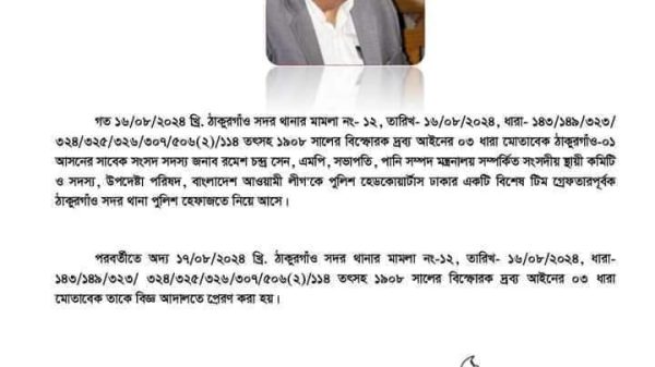 স্টাফ রিপোর্টর মো: নাইয়ুম ইসলাম, ঠাকুরগাঁও এই মামলায় শনিবার বিকেল সাড়ে তিনটায় সাবেক এমপিকে রমেশ চন্দ্র সেনকে আদালতে তোলা হলে জুডিশিয়াল ম্যা-জিষ্ট্রেট কোর্টের বিচারিক রাজিব কুমার