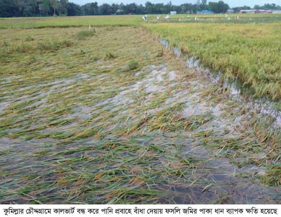 লুৎফুর রহমান রাকিব কুমিল্লা জেলা প্রতিনিধি :কুমিল্লার চৌদ্দগ্রামে কালভার্ট বন্ধ করে পানি প্রবাহে বাধা দেয়ায় বিপুল পরিমাণ জমির ফসলের ক্ষতি হয়েছে। আমন ধানসহ শাকসবজি পানিতে ডুবে যাওয়ায় কৃষকরা দিশেহারা হয়ে