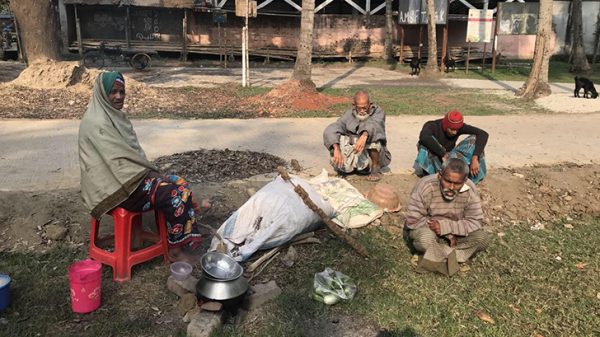 খোলা আকাশে নিচে আছিয়া বেগম (৬০) চুলার ওপর ডালভর্তা আর ভাত রান্না করছেন। পাশে বসে আছেন দৃষ্টিপ্রতিবন্ধী স্বামী মইরুলদ্দিন (৬৭), প্রতিবন্ধী ছেলে মনিরুল ইসলাম (৪৫) ও প্রতিবন্ধী নাতি মিনারুল ইসলাম