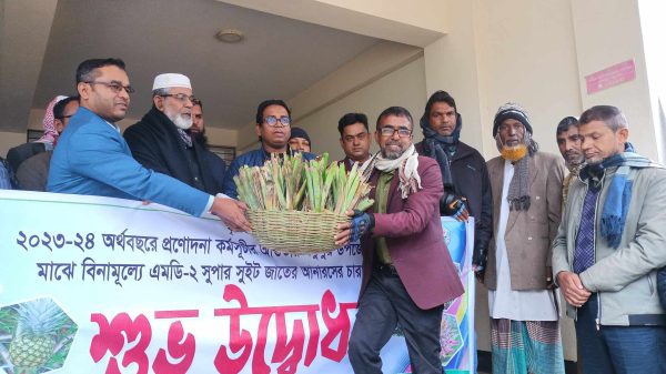 আঃ হামিদ মধুপুর টাঙ্গাইল প্রতিনিধিঃ টাঙ্গাইলের মধুপুরে ফিলিপাইন থেকে আমদানিকৃত এমডি-২ সুপার সুইট জাতের আনারসের চারা চাষিদের মাঝে বিতরণের শুভ উদ্বোধন করা হয়েছে। বুধবার (৩ রা জানুয়ারী) সকালে মধুপুর উপজেলা